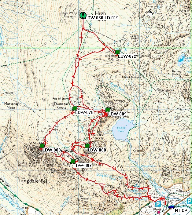 Now it was just a matter of getting safely back down to the New Dungeon Ghyll on the slippy stepped path below the crags of Pike Howe. The path was treacherous and I did slip twice,on the steps which Fix The Fells had carved into the natural rock - thankfully without any damage being done to me. Dungeon Ghyll Force was in full flow - a sight for sore eyes indeed, and the rain continued for most of the rest of the day. I reached the car park at 12.10pm with the descent from Harrison Stickle LDW-068 having taken me 67 minutes.